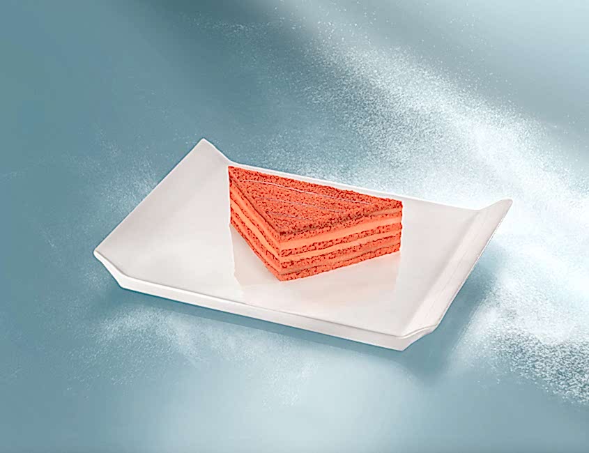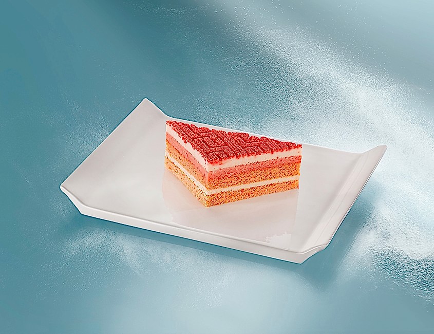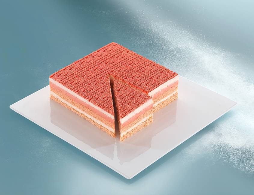 Beyaz çikolata,özel karışımlı çilekli mus (mus’un içeriği çilek özü,süt ve krema) ve tabanı fındık tozundan oluşmkata.